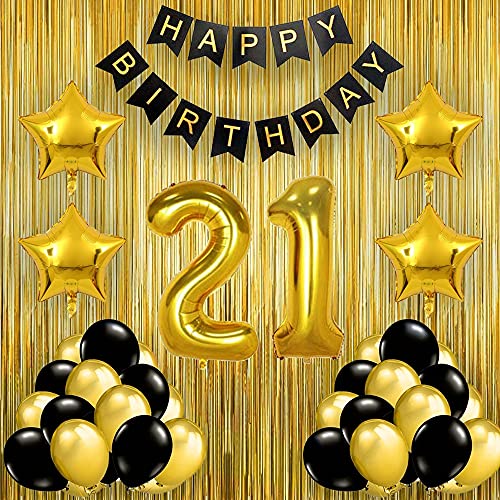 HomeBabyParty SuppliesPop The Party Black Gold 21st Birthday Party Decorations with Birthday Banner, Star, Latex Balloons, Curtains and 21 Digit No. Set of 39 Supplies