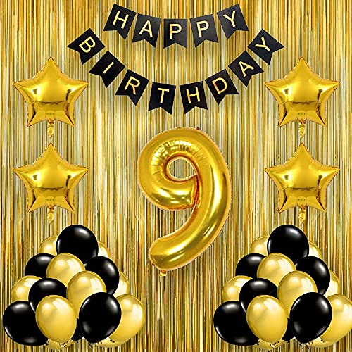 HomeBabyParty SuppliesPop The Party Black Gold 9th Birthday Party Decorations with Birthday Banner, Star, Latex Balloons, Curtains and 9 Digit No. Set of 39 Supplies