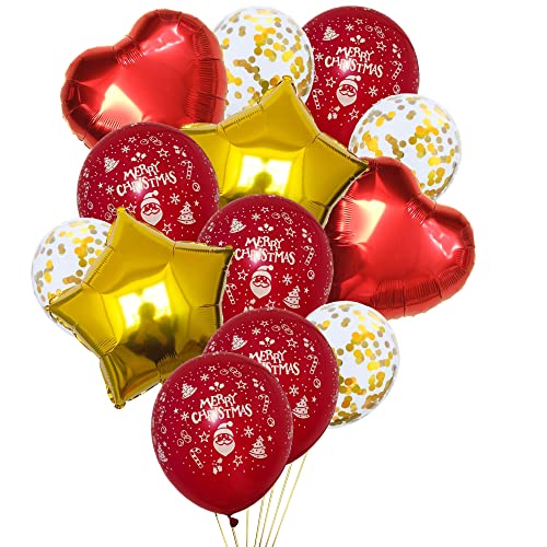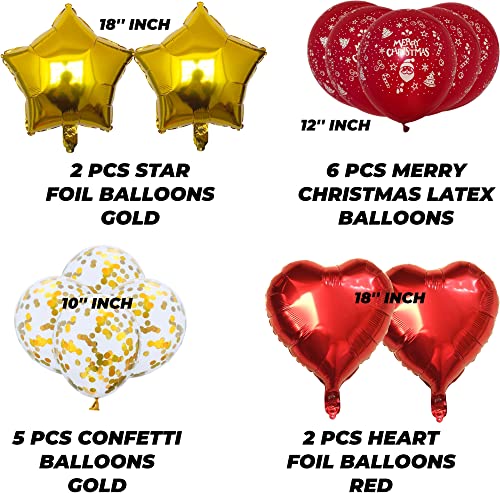 Pack Includes: 2 Pcs 18" Inch Star Foil Balloon 6 Pcs Merry Christmas Printed Latex Balloons 5 Pcs Golden Confetti Balloons 2 Pcs 18" Inch Red Heart Foil Balloon