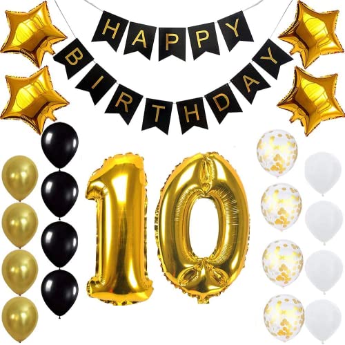 Pop The Party Gold 10th Birthday Decoration Kit With Banner ,Star Latex and confetti Balloon Set of 23