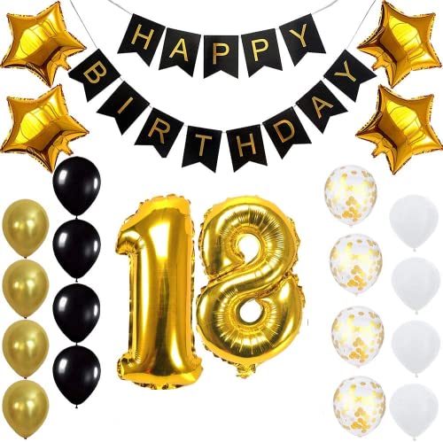 Package List: 1 X Happy Birthday 4X Star Foil Balloon 4Gold Latex4Black Latex 4White Latex 4 Gold Confetti Balloon 1X Digit Foil Balloon