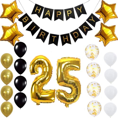 Pop The Party Gold 25th Birthday Decoration Kit With Banner ,Star Latex and confetti Balloon Set Of 23