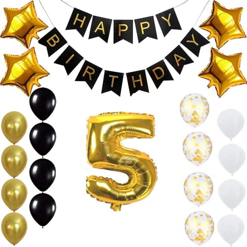 Pop The Party Gold 5th Birthday Decoration Kit With Banner ,Star Latex and confetti Balloon Set of 22