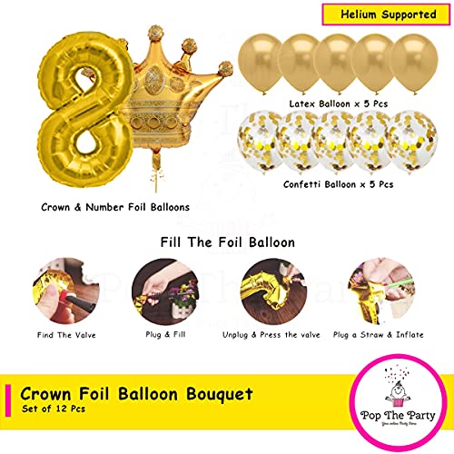 HomeBabyParty SuppliesPop The Party Gold 8 Digit Number foil Balloon with Crown Foil, Confetti and Latex Balloon for Birthday Anniversary Balloon Set of 12