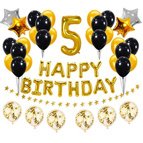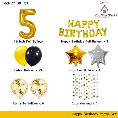 HomeBabyParty SuppliesPop The Party Golden and Black 5th Birthday Party Decorations Set- Gold Happy Birthday Banner,Foil Number Balloons, Latex Balloons and More for 5 Years Old Birthday Party Supplies