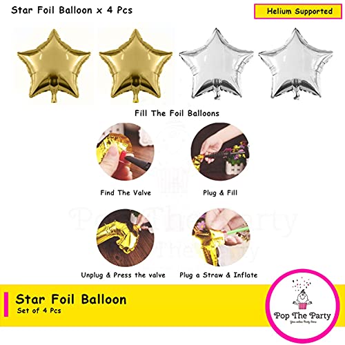 Pop The Party Golden Silver Star foil Balloon with Bunting for Birthday Decoration Set of 6