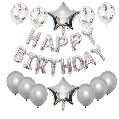 Pop The Party Happy Birthday Balloons Decorations Set- 13 pcs Letter Balloons Banner ,2 pcs Giant Star Foil Balloons,4 pcs Confetti Balloons,6 pcs Latex Balloons (Silver)