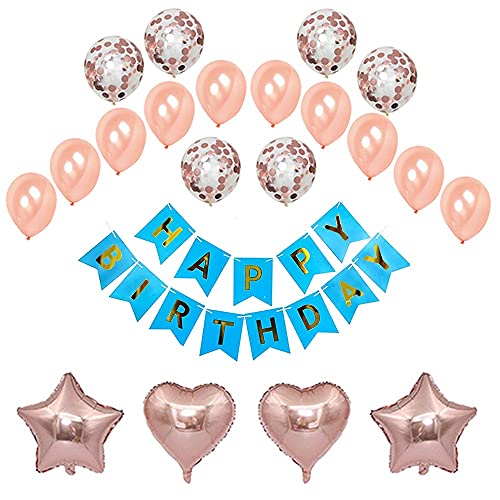HomeBabyParty SuppliesPop The Party Happy Birthday Blue Banner with 14 pcs Rose Gold Balloon Including Star and Heart Foil Balloon 5pcs Latex & 5 pcs Confetti Balloon Set