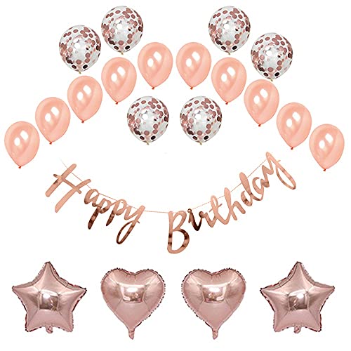 HomeBabyParty SuppliesPop The Party Happy Birthday Cursive Rose Gold Banner with 14 pcs Rose Gold Balloon Including Star and Heart Foil Balloon 5pcs Latex & 5 pcs Confetti Balloon Set