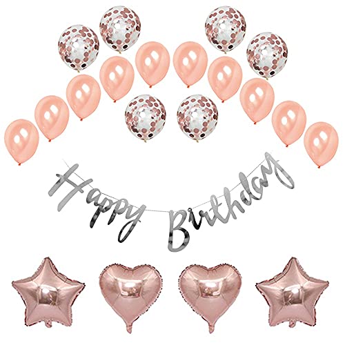 HomeBabyParty SuppliesPop The Party Happy Birthday Cursive Silver Banner with 14 pcs Rose Gold Balloon Including Star and Heart Foil Balloon 5pcs Latex & 5 pcs Confetti Balloon Set.