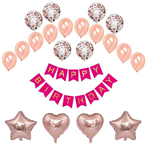 HomeBabyParty SuppliesHappy Birthday Dark Pink Banner with 14 pcs Rose Gold Balloon Including Star and Heart Foil Balloon 5pcs Latex & 5 pcs Confetti Balloon Set
