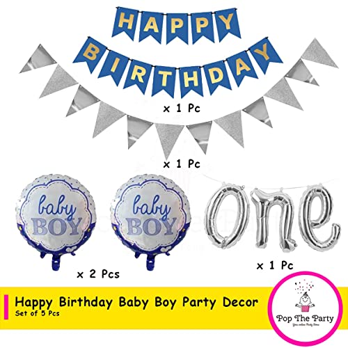 HomeBabyParty SuppliesPop The Party Its Boy Birthday Decoration with one Letter foil Balloon,Happy Birthday Banner, Baby Boy Round Foil and Tringle Bunting