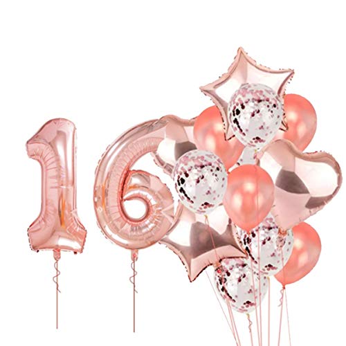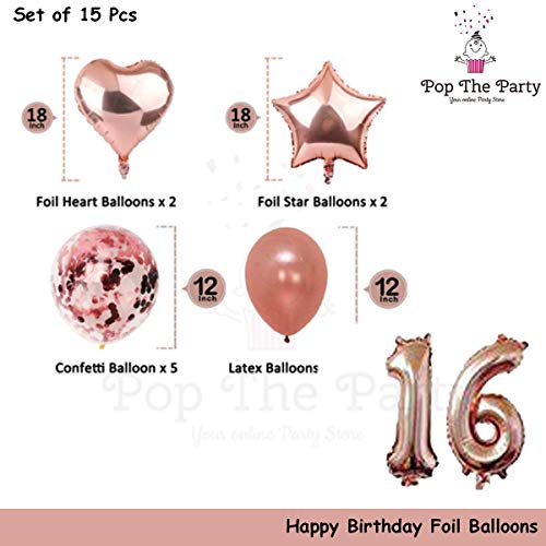 HomeBabyParty SuppliesPop The Party Rose Gold 16 Balloon for 16th Birthday -Large Pack of 16 | Rose Gold Confetti Star and Heart Foil Balloon Bouquet for Party Decoration | Great for 16th Birthday Party Decoration Suplies