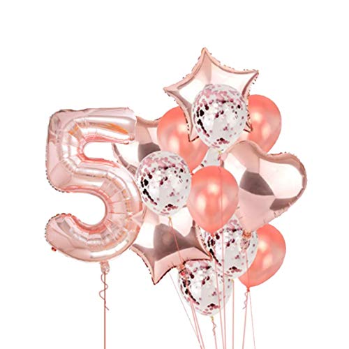 HomeBabyParty SuppliesPop The Party Rose Gold 5 Balloon for 5th Birthday -Large Pack of 15 | Rose Gold Confetti Star and Heart Foil Balloon Bouquet for Party Decoration | Great for 5th Birthday Party Decoration Suplies