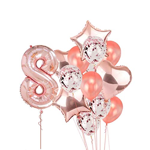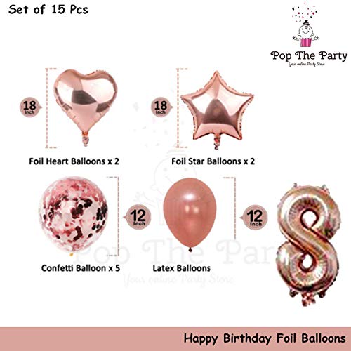 HomeBabyParty SuppliesPop The Party Rose Gold 8 Balloon for 8th Birthday -Large Pack of 15 | Rose Gold Confetti Star and Heart Foil Balloon Bouquet for Party Decoration | Great for 8th Birthday Party Decoration Suplies