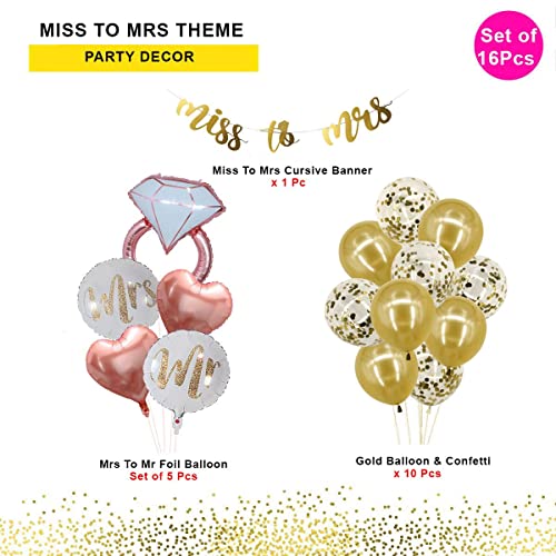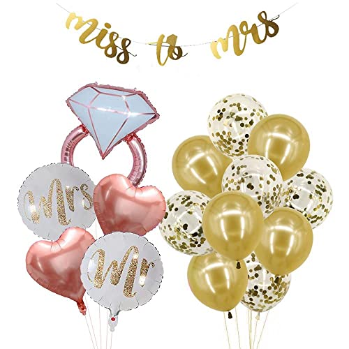Packege Include:1 Ring Foil Balloon1Miss To Mrs Banner2 Heart Foil Balloon2 Round Foil Balloon5Pcs Confetti Balloon5 Latex Balloon