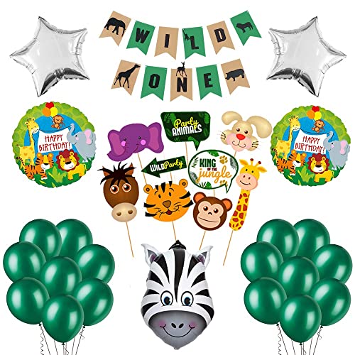 Zebra Jungle Theme Decoration with Wild One BannerPropsRound and Star Foil Balloon Set