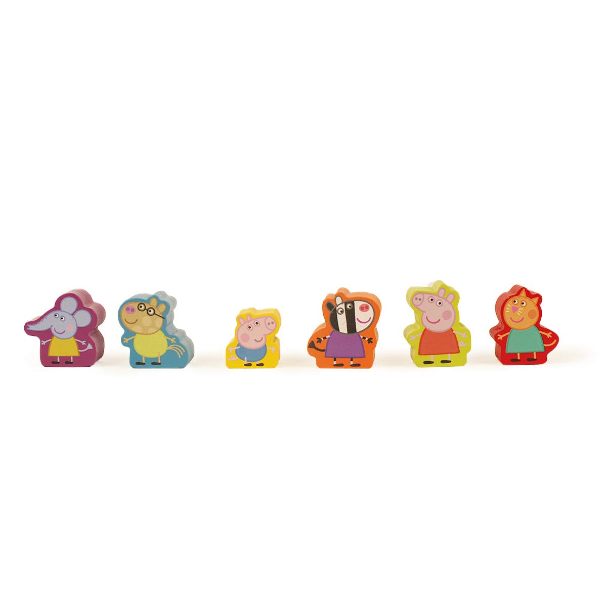 INCLUDES: Set of 8 brightly coloured wooden blocks of various shapes and colours each with a different character from Peppa pig and friends.