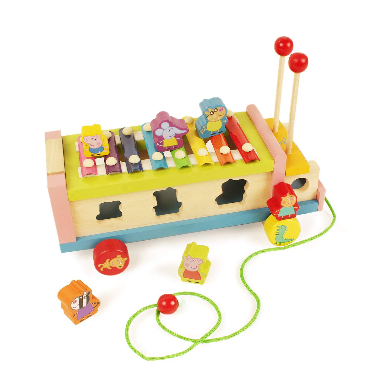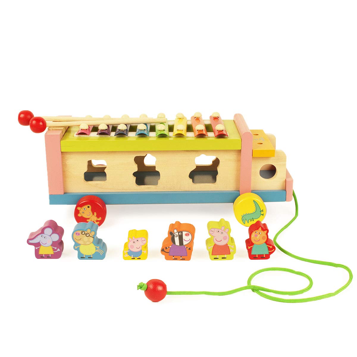 3-IN-1 PEPPA PIG & FRIENDS PULL ALONG: Wooden shape sorting toy truck with a Xylophone that makes learning fun for your pre-schooler as it enhances multi skill development.